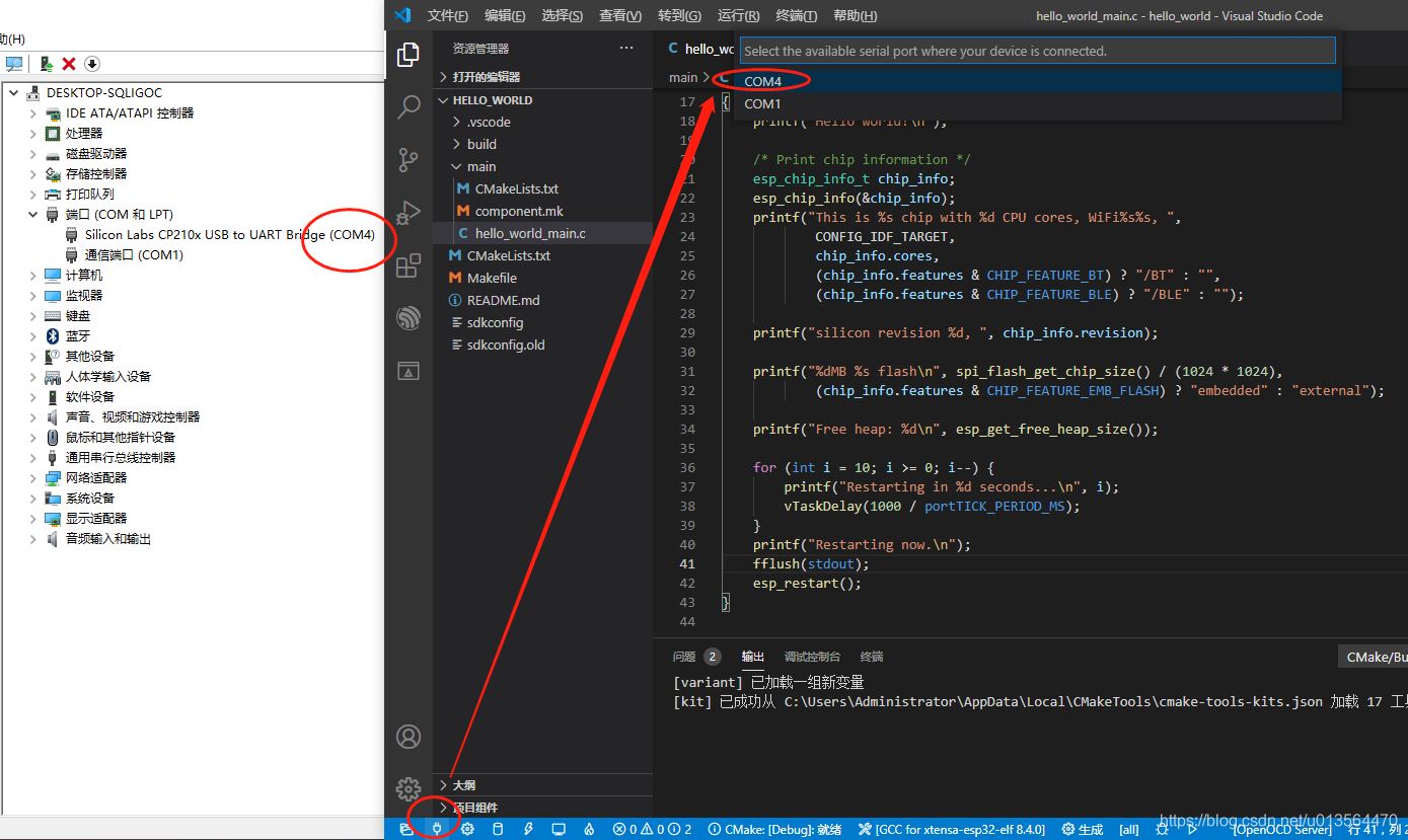 选择我们连接的板子的端口,不知道的在设备管理器中查看。这里我的是COM4