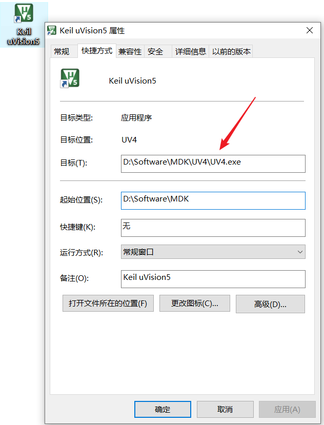 这里在桌面找到Keil的图标,右键查看文件所在位置,就能看到keil的可执行文件的路径,把它复制到上面就可以了。