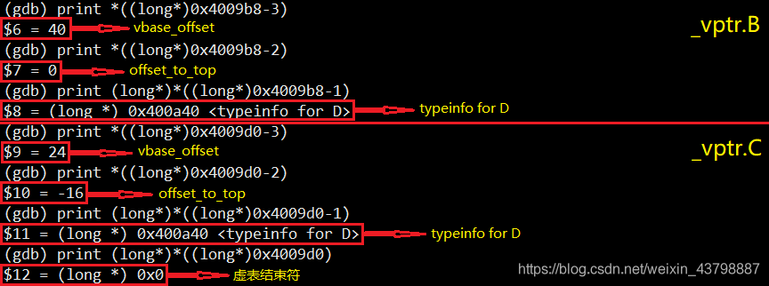 _vptr.B - 1:这里存储的是typeinfo for D,里面的内容其实也是一个指针,指向的是类D的运行时信息,这些玩意都是为了支持RTTI的。RTTI的相关内容以后会讲,这里就先不多分析了。_vptr.B - 2:这里存储的是offset_to_top,这个表示的是当前的虚表指针距离类开头的距离,可以看到对于_vptr.B来说这个值就是0,因为_vptr.B就存在于类D的起始位置,而对于_vptr.C来说这个值是-16,大家可以算一下_vptr.C与类D的起始位置确实是差两个地址也就是16个字节(64位系统),至于为什么是负数,这是因为堆内存是向下增长的,越往下地址数值越大。