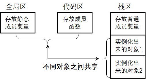 虽然为了集成,我们将其写到一个类里面,但是只有普通成员变量真正属于类的对象,类的所有对象共享一份静态成员函数,静态成员变量和普通成员函数。画出了内存模型,如下图所示: