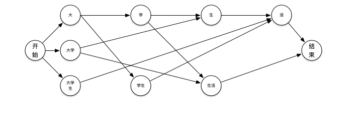可以用一个有向图来表示这个集合的分词组合,从开始节点到结束节点的全部路径就是所有分词方式。