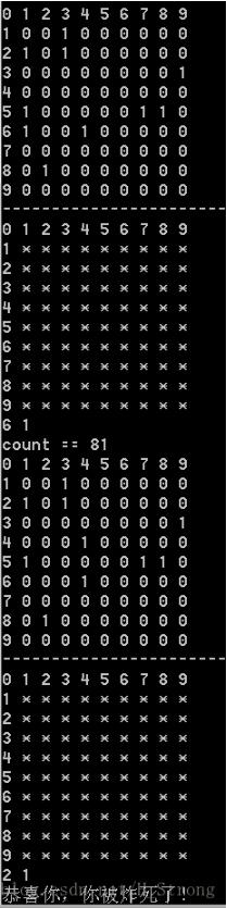 接下来如果flag==1时,开始进行扫描,看看show中还剩下几个星号,如果剩下10个星号,那么就证明扫完了,此时打印获胜信息,并break跳出循环。如果没有剩下10个星号,那么将已有的count信息清除,继续进行以上步骤。