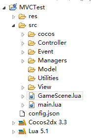 其中cocos、Controller、Model、View这个不用多说,Event里面保存的全局消息类型,Managers是用于管理游戏中的东东的,比如管理资源,管理各种场景切换,层的切换等等。Utilities提供一些工具类,比如字符串的处理等。大家也可以根据自己的需求来定制目录,比如定义一个NetCenter文件夹,专门用于处理网络的。本例子中没有用到数据操作和工具类,所以这两个文件夹为空。