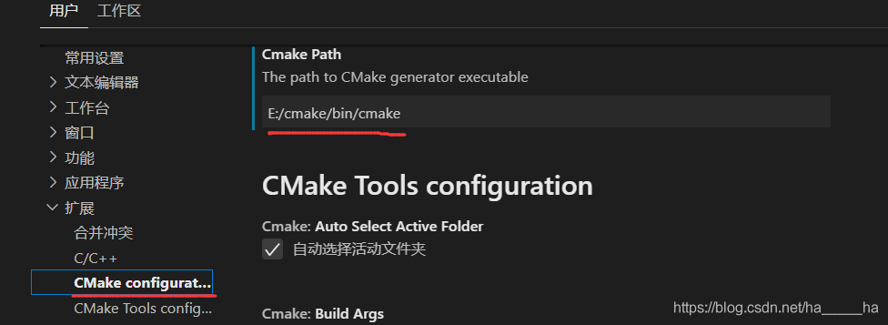 (2)同样是在扩展一项中,找到cmake configuration,并将Cmake Path设置为前面cmake的安装路径,如图