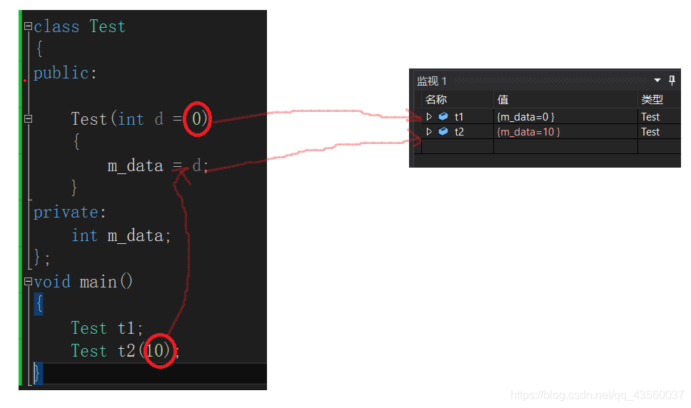 主函数初始化时如果无参则以缺省值0给成员变量赋值。