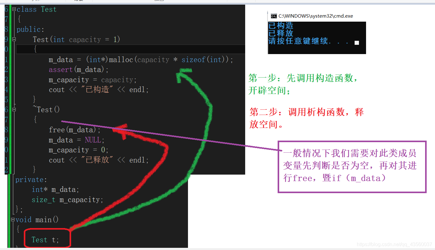 析构函数:与构造函数功能相反,析构函数是完成对象的销毁,局部对象销毁工作是由编译器完成的。而对象在销毁时会自动调用析构函数,完成类的一些资源清理工作,和构造函数一样,如果我们没写析构函数,系统会生成一个默认析构函数,但这个析构函数什么都不会做。