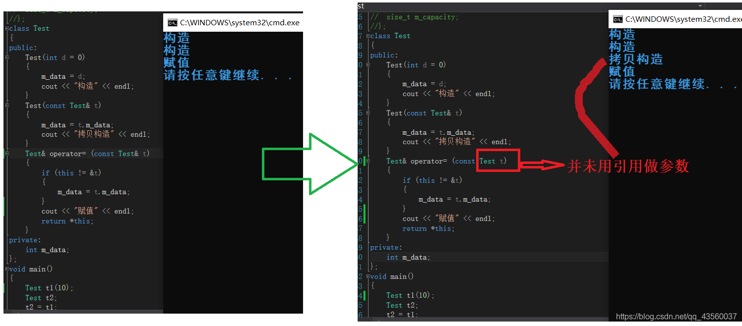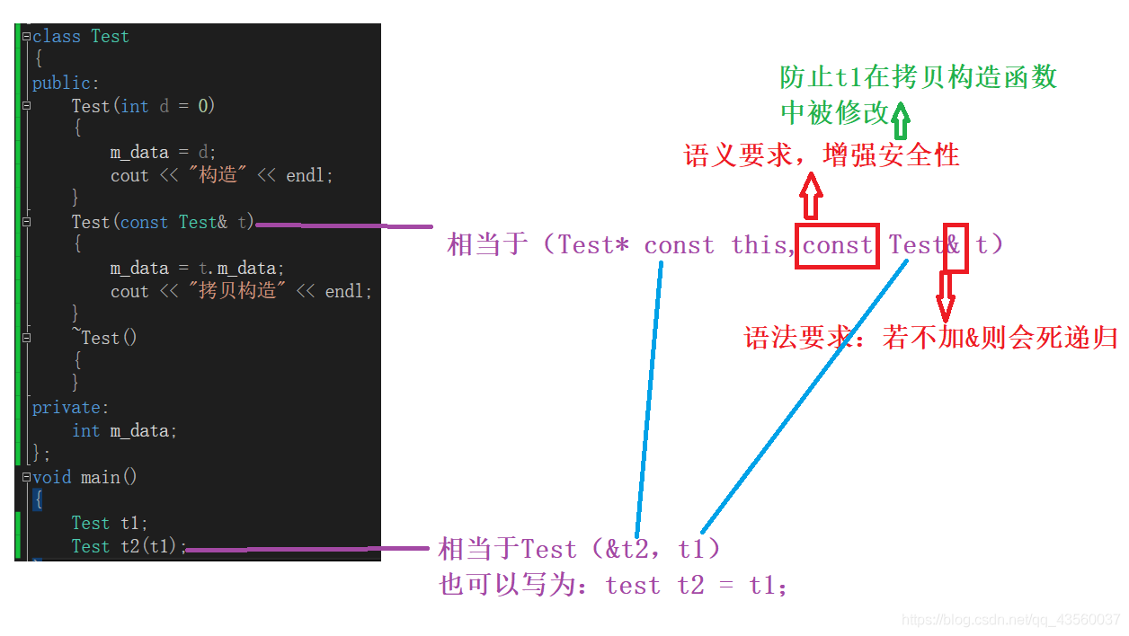 2.拷贝构造函数的参数只有一个(当然还有个隐藏的*this)且必须使用引用传参,使用传值方式会引发死递归。