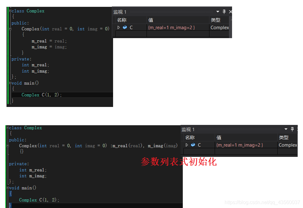 给出一个复数类,参数列表初始化的效率要高于第一种初始化方式。