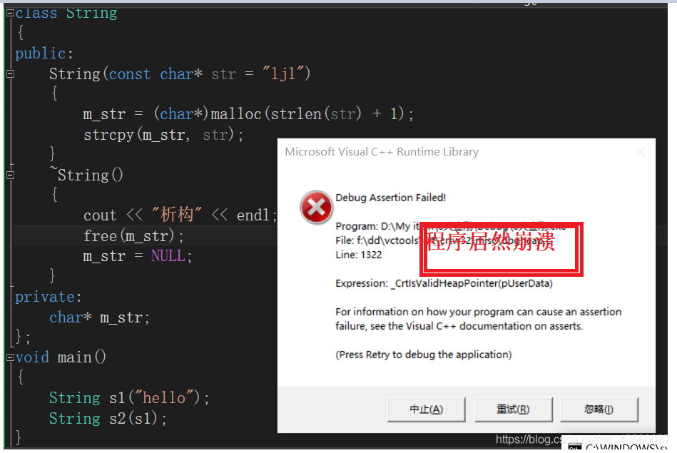上面s1使用hello初始化,s2使用s1的值来拷贝,因此s2并未开辟新空间,而是指向s1的空间,因此在最后调用析构函数的时候,对同一块空间free了两次。