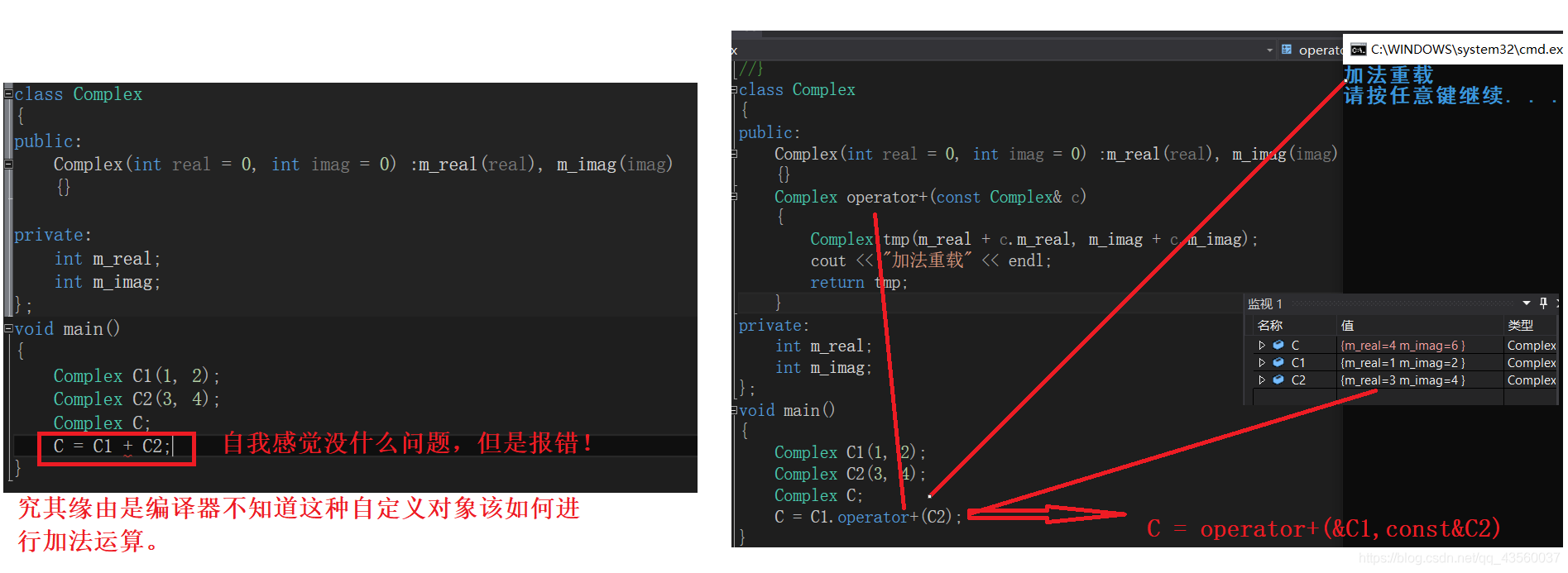 2.C1调用加法重载函数进行C1+C2;