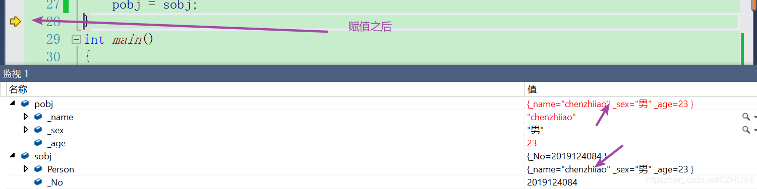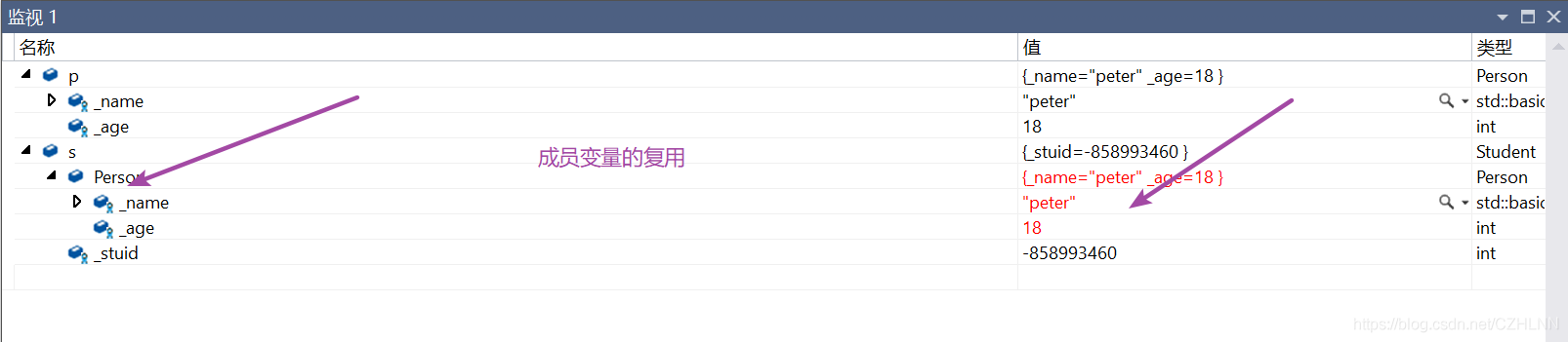 继承后父类的Person的成员(成员函数+成员变量)都会变成子类的一部分。这里体现出了Student复用了Person的成员。下面我们使用监视窗口查看Student对象,可以看到变量的复用。调用Print可以看到成员函数的复用。