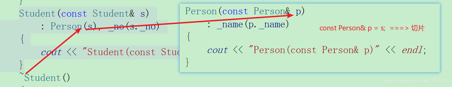 派生类的拷贝构造函数必须调用基类的拷贝构造完成基类的拷贝初始化,下面代码中的 Person(s) 有切片行为。