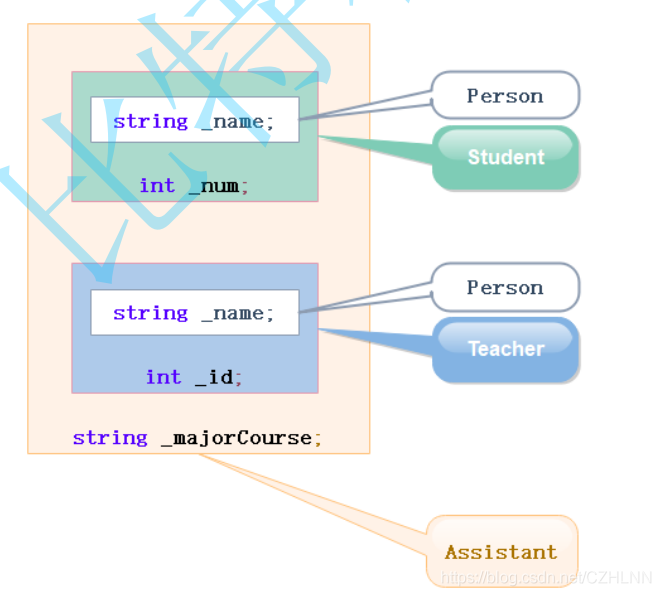 虚拟继承可以解决菱形继承的二义性和数据冗余的问题。如上面的继承关系,在Student和Teacher的继承,Person时使用虚拟继承,即可解决问题。需要注意的是,虚拟继承不要在其他地方去使用,改进上面的代码。