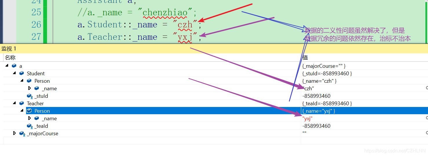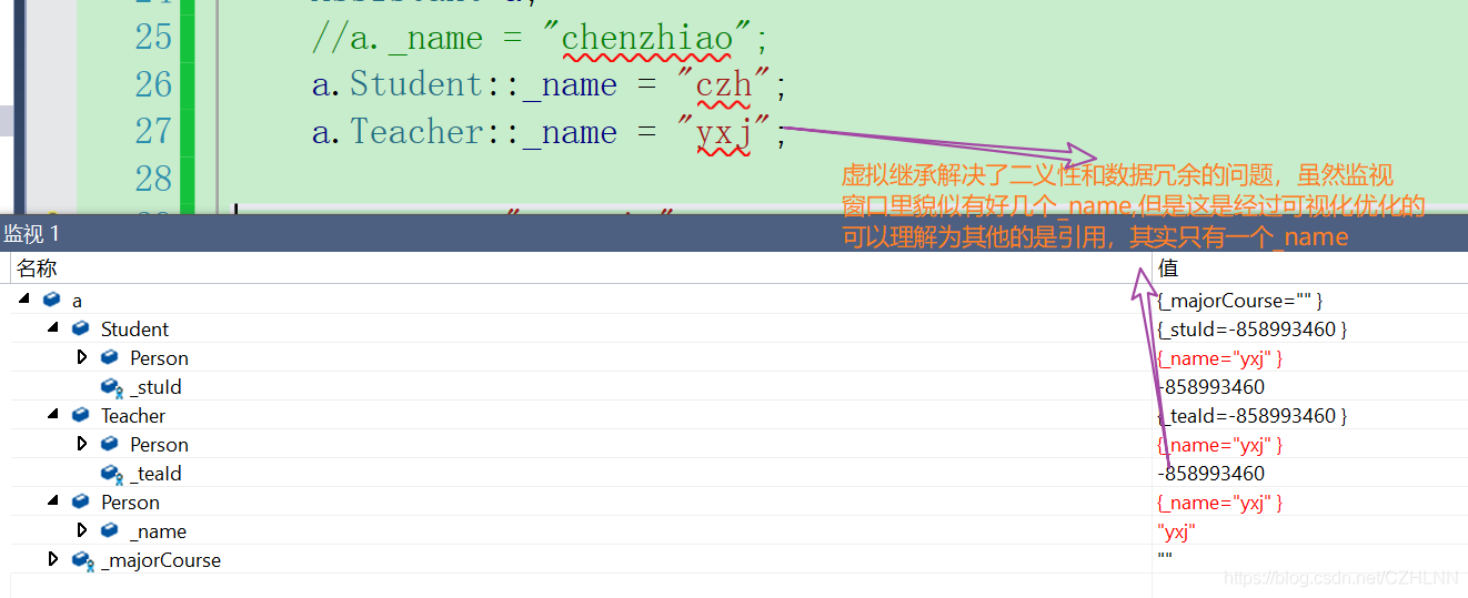 // 在菱形继承的“肩膀处”添加完 virtual 关键字,完成虚拟继承,可以解决数据的二义性和冗余问题。我们来看一下监视窗口