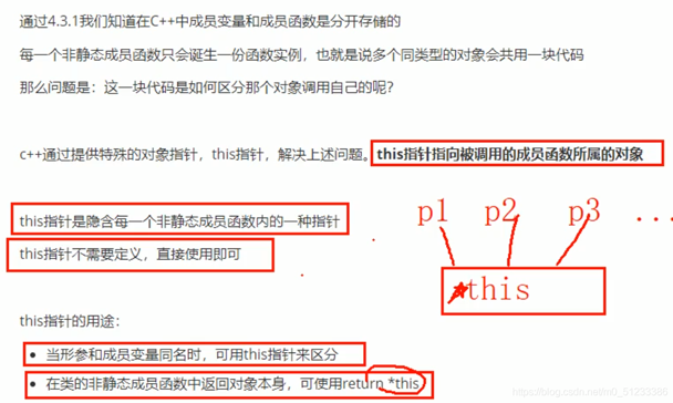 每一个非静态成员函数只会诞生一份函数实例,也就是说多个同类型的对象会共用一块代码那么问题是:这—块代码是如何区分那个对象调用自己的呢?