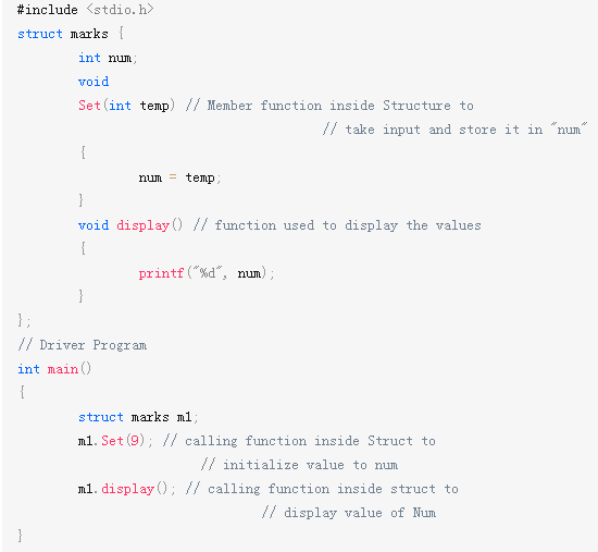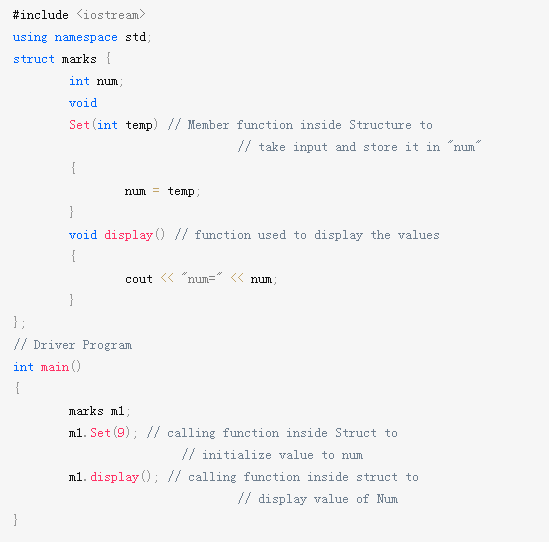 结构内部的成员函数:C中的结构不能在结构内部具有成员函数,但是C ++中的结构可以与数据成员一起具有成员函数。