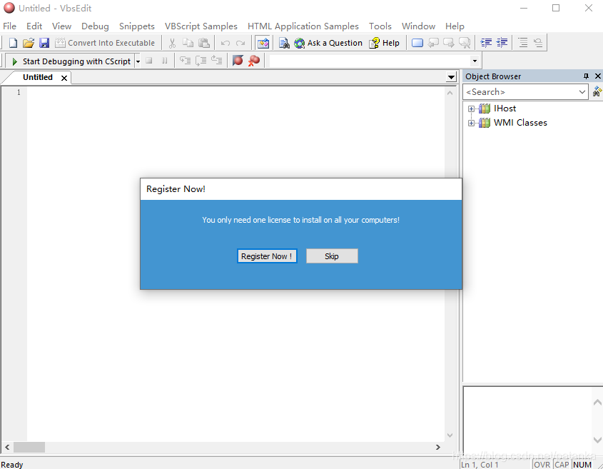近期需要批量处理一些word和excel文档,开始一直用word的宏,但是发给同事用的时候同事老是不会啊。后来就想写一些VBS的脚本,让他们直接双击运行就好了。可是写VBS脚本也需要调试的呀,没有合适的工具很恼火的。于是上网找到了VBSEdit这么个工具,可是非注册版每次调试都会弹出一个提示框,等好多秒,找破解版要么版本太老,要么就是夹带私货的。于是就想自己动手试一下好了。