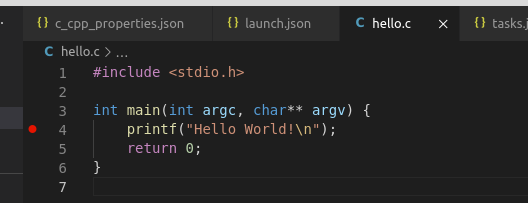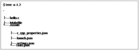 hello.c 是一个演示代码,Makefile 是编译规则文件,.vscode 文件夹中四个 json 文件即用于配置 Visual Studio Code。