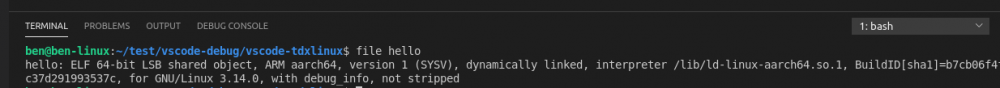 编译完成后可以通过 file 命令查看 hello 程序的格式属性,ARM aarch64 格式。