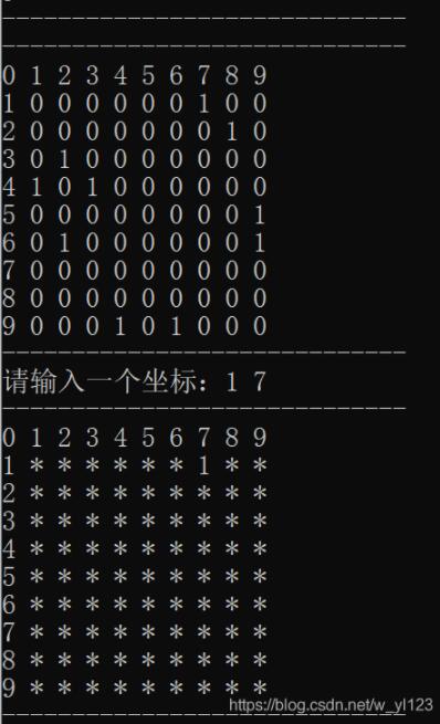 第一个数组仍然为布置雷后打印出的数组,我们可以看到(3,3)位置及周围都没有雷,所以我们输入(3,3)看到其周围8个位置也被搜索
