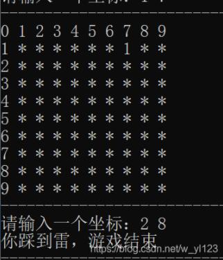 3.由上图可知(2,8)存放的有雷,这时我们输入(2,8)(不是第一次输入),游戏结束