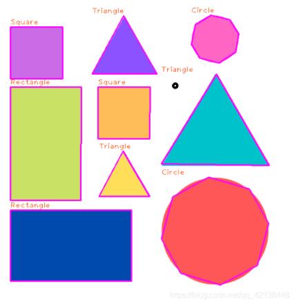 当检测出所有图形都应具有拐角点数之后,在加个if 判断图形的点数,之后通过puttext函数去显示,图形的形状。