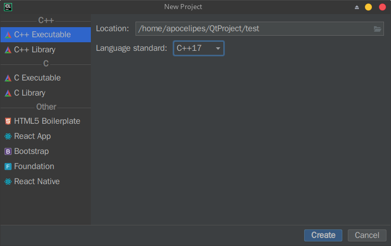 下面是创建Qt5项目,CLion没有区分普通c++项目和Qt项目(毕竟Qt项目一般也是c++项目或者c++/QML项目),所以这样创建即可: