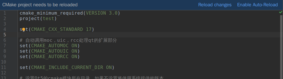 事先要说明的一点是,CLion是根据CMakeLists.txt文件来组织和设置项目的,所以如果我们需要添加诸如Qt这样的第三方库或是改变编译行为,都只要修改CMakeLists.txt即可。