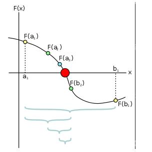 上面所示的一个迭代过程的第一次的迭代区间是 [a1,b1],取中点 b2,然后第二次的迭代区间是 [a1,b2],再取中点 a2,然后第三次的迭代区间是 [a2,b2],然后取 a3,然后第四次的迭代区间是[a3,b2],再取红色中点 c,我们得到发现 f(c) 的值已经小于ϵ,输出c 作为近似解。