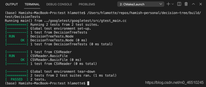 上面显示了在终端中通过测试的谷歌Test的输出。