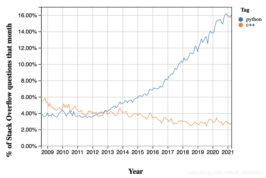 从上面我们可以看到,现在每个月被回答的与Python相关的问题比c++多4倍。在这里查看这些统计数据的当前状态。