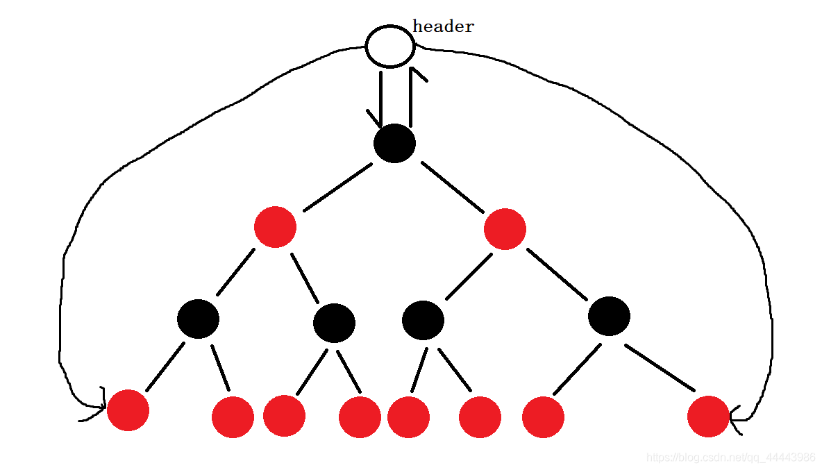 和普通的红黑树不同的是,在根节点上再加了一个头结点,该结点不是真实的结点,只是一个辅助结点,是为了后面实现红黑树的迭代器而出现的。该header结点的父节点就是真实的根节点,其左孩子是这棵树的最左结点,其右孩子是这棵树的最右节点。