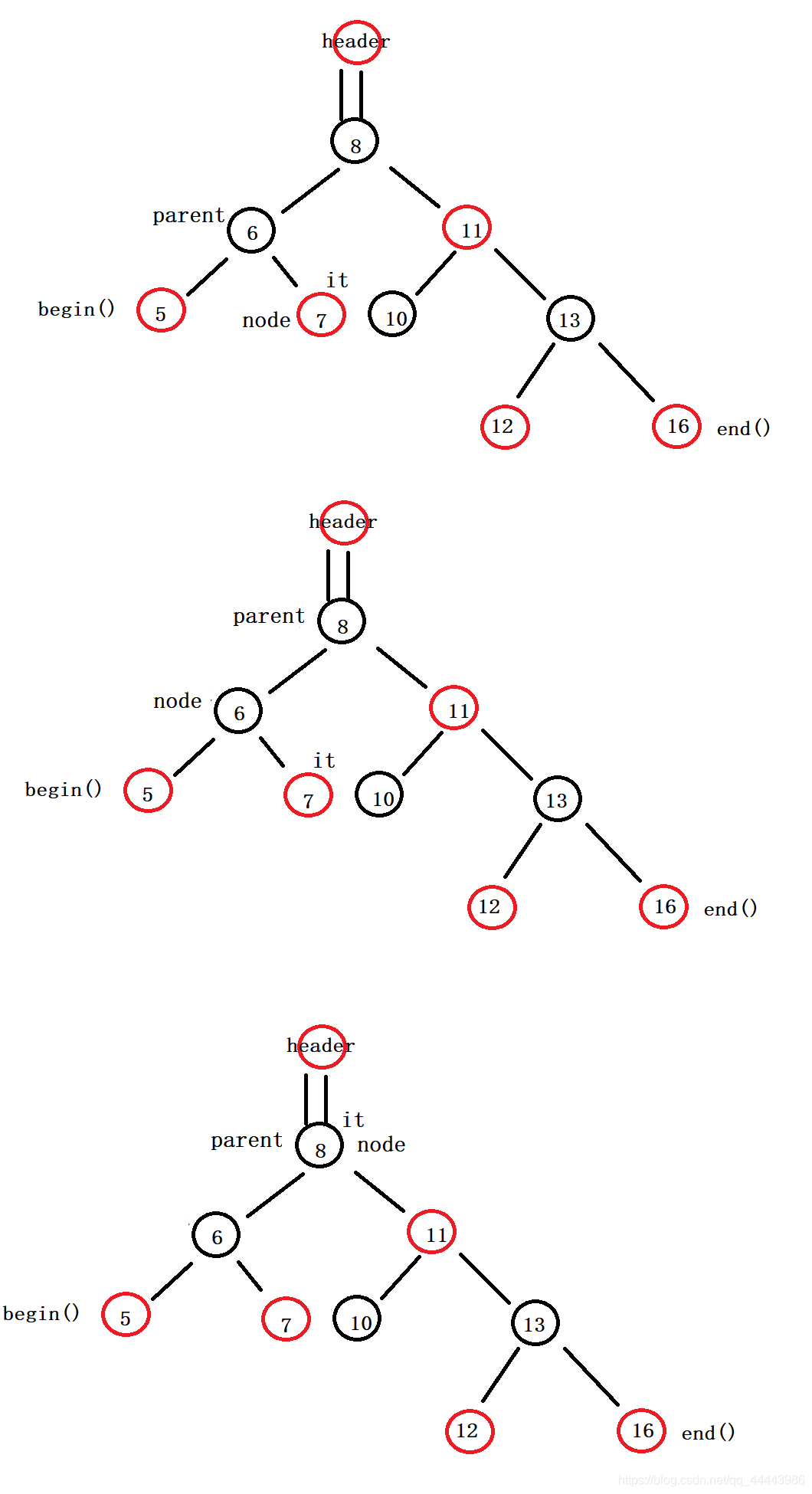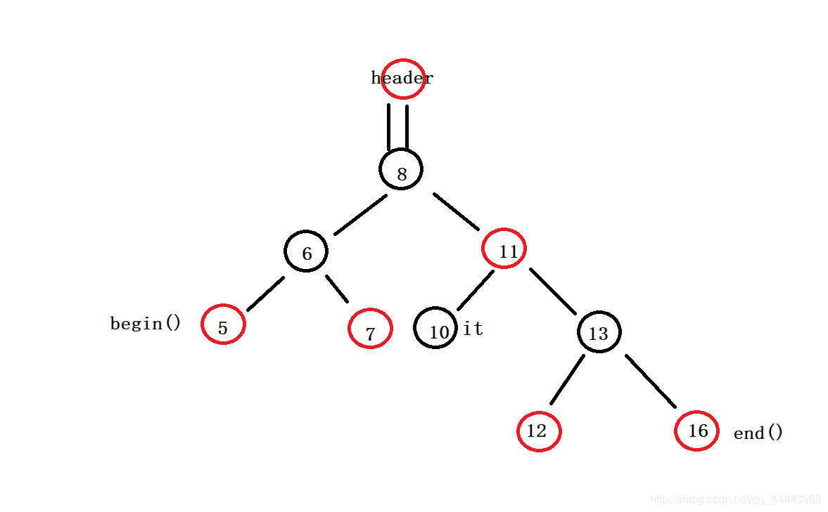 这样子对迭代器的++是一个死操作,永远不会走到空的位置。所以我们需要再跟结点处做特殊的处理。当node结点的右孩子为自己的父亲时,就不用更新结点了,此时已经走到end()的了,如果还更新置parent结点,则该++操作就没有发生改变