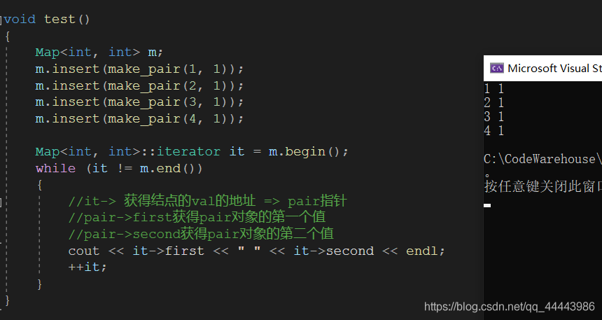 插入的返回值是返回一个pair对象,所以我们在插入时的返回值都需要修改成一个pair对象,且pair对象的first为插入后的结点的迭代器,second为插入是否成功