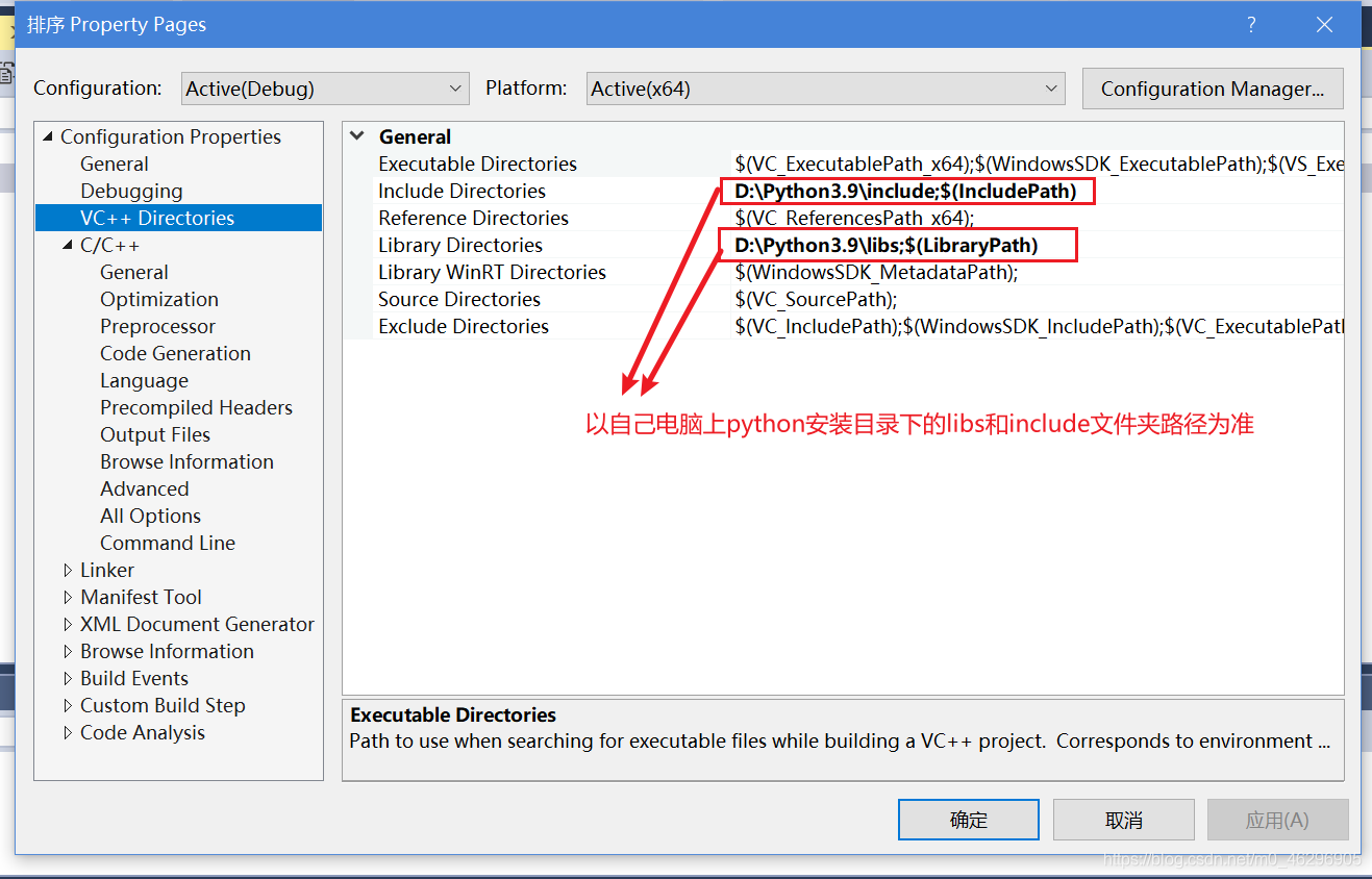 在属性窗口双击“VC++ Directories”(VC++目录),把在Include Directories (包含目录)和 Library Directories(库目录)下添加python安装路径下的include和ibs文件夹的路径。