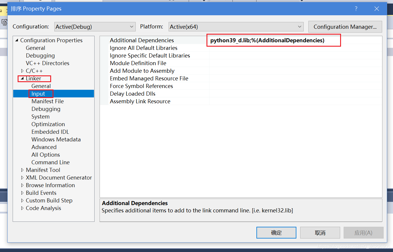 双击“linker”(链接器)下的“Input”,添加python39_d.lib这个依赖项
