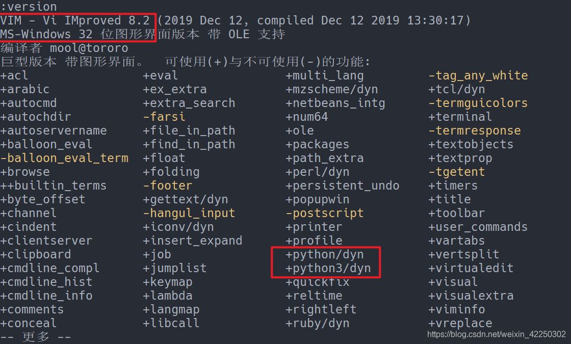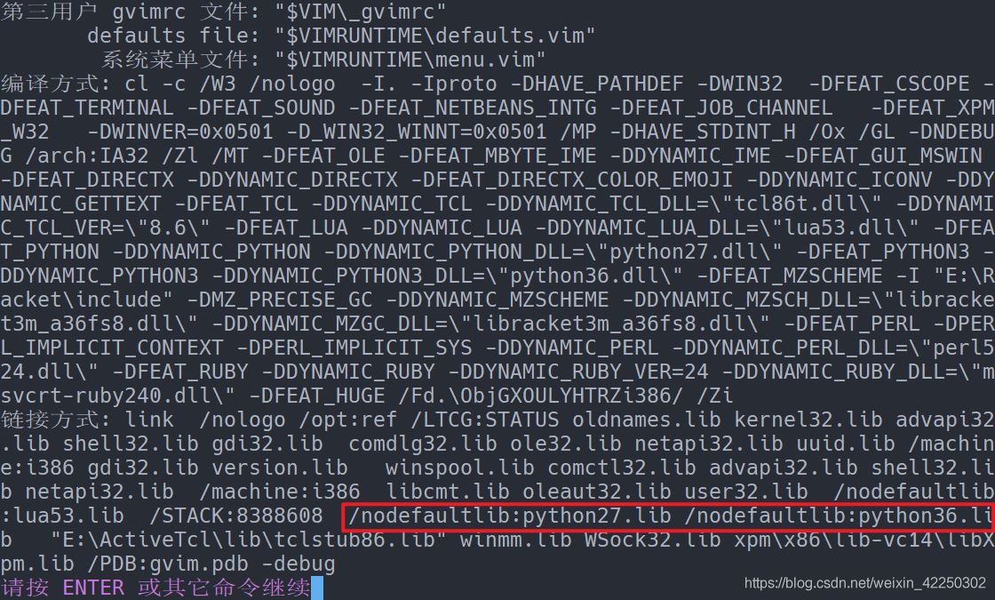从输出可以看出,我用的vim是32位的vim8.2,此版本支持python,且所用的python版本为python2.7及python3.6。由于配置环境过程中用到的插件与vim使用的python版本有关,所以下面先为vim配置python。