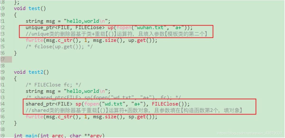 1)很多时候我们都用new来申请空间,用delete来释放。库中实现的各种智能指针,默认也都是用delete来释放空间,但是若我们采用malloc申请的空间或是用fopen打开的文件,这时我们的智能指针就无法来处理,因此我们需要为智能指针定制删除器,提供一个可以自由选择析构的接口,这样,我们的智能指针就可以处理不同形式开辟的空间以及可以管理文件指针。