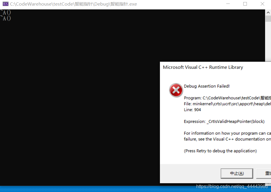 运行结果2:调用两次析构函数,也就说明一份资源被释放两次。