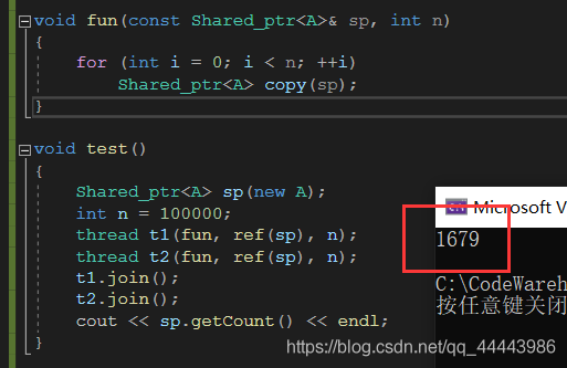 我们实现的shared_ptr智能指针在多线程的场景下其实是不存在线程安全问题的----引用计数器指针是一个共享变量,多个线程进行修改时会导致计数器混乱。导致资源提前被释放或者会产生内存泄漏问题
