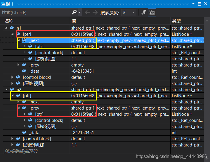 在C++11中,专门为了解决这个问题,又引入了一种新的智能指针waek_ptr,这种指针称为弱指针。在赋值或者拷贝的时候,计数器并不会进行++。析构时也并不会进行真正资源的释放。waek_ptr不能单独使用,其最大的作用就是解决shared_ptr循环引用的问题。