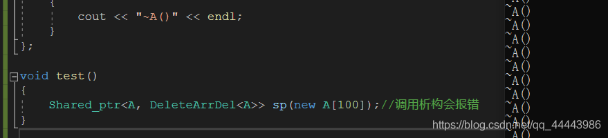 Shared_ptr<A> sp(new A[100]);//调用析构会报错