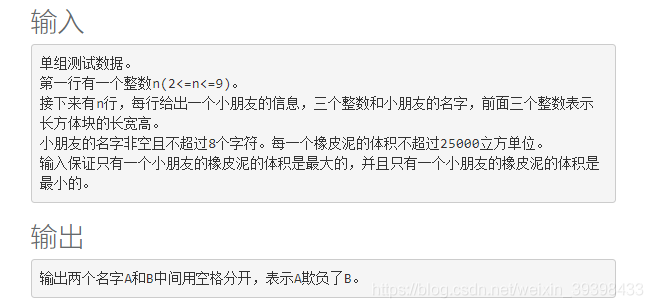 幼儿园里面的小朋友在玩橡皮泥,每一个小朋友都有一块橡皮泥。每一块橡皮泥都是一个长方体块。从橡皮泥的大小可以看出哪一个小朋友是老大,哪一个小朋友是小弟。拥有橡皮泥体积最大的小朋友总喜欢欺负拥有橡皮泥体积最小的小朋友。
