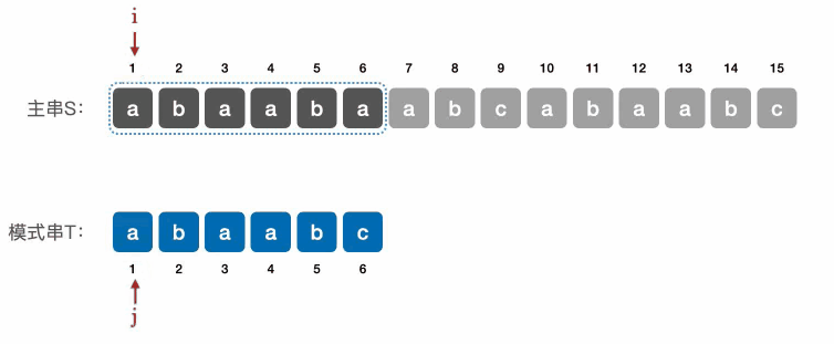 若当前⼦串匹配失败,则主串指针 i 指向下⼀个⼦串的第⼀个位置,模式串指针 j 回到模式串的第⼀个位置