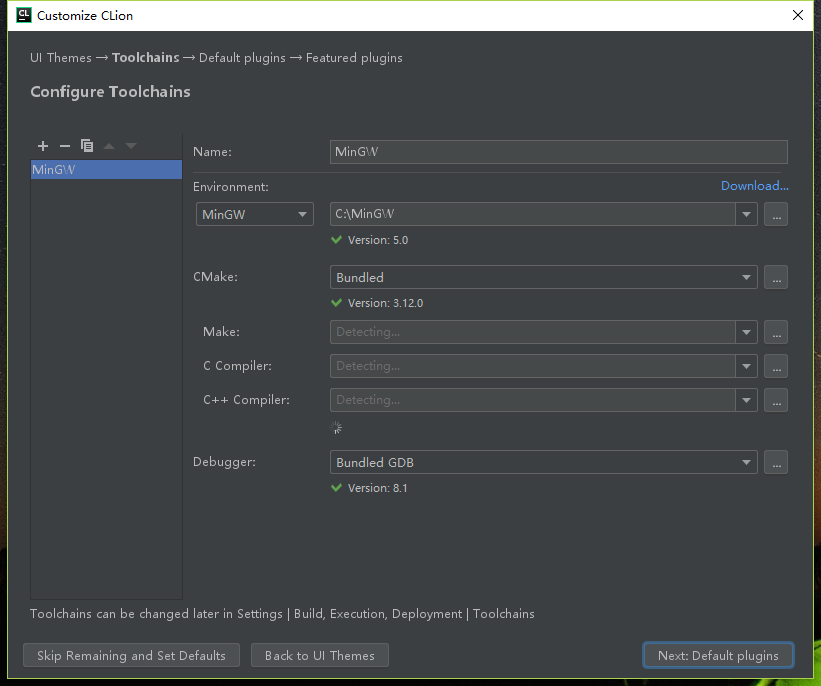 1、打开Clion,会有大概如下的界面,由于是刚下载好的环境,会自动识别你安装的东西