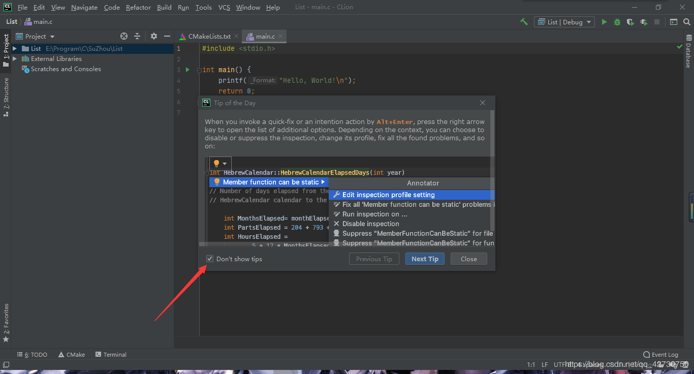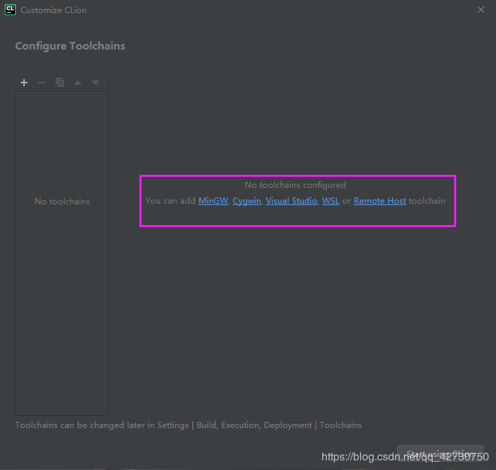 进去之后把这个提示框的√给它打上,不然每次启动CLion,它都会弹出来: