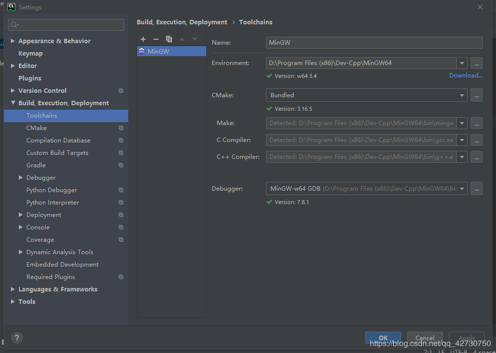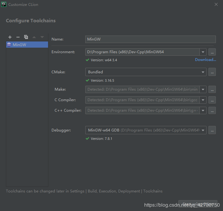 这里主要就是配置一下Environment,点击对应最右边的三个点去找刚刚你安装的MinWG的路径,选择后其他选项就会自动配置,就像下面这样: