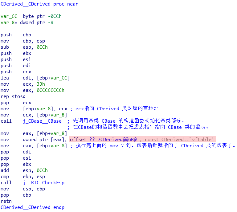 CDerived 构造函数的反汇编代码如下(关键部分已注释):