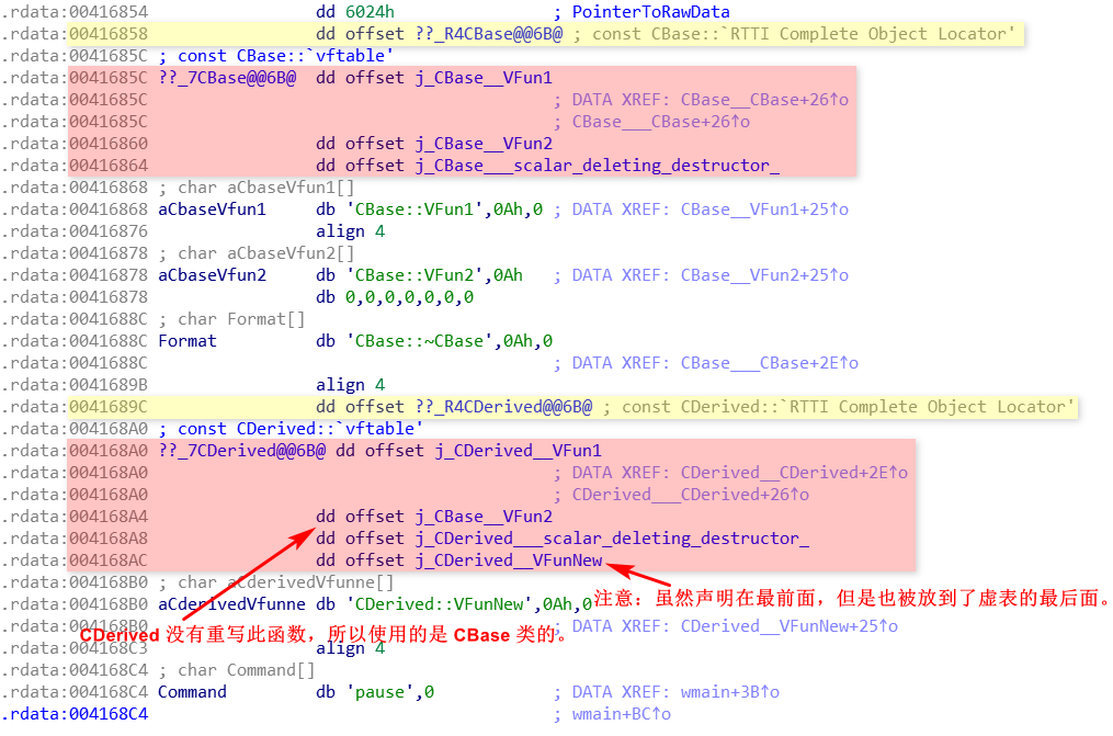 vftable 是在类的构造函数中初始化的。可以在 IDA 中分别查看 CBase 类 和 CDerived 类的构造函数的反汇编代码。