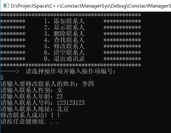 - 修改联系人:按照姓名重新修改指定联系人
